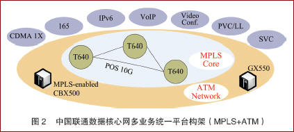 中國聯(lián)通IP電話網(wǎng)的承載網(wǎng)分為核心層和區(qū)域?qū)觾杉?jí)結(jié)構(gòu),核心層由北京、上海、廣州、沈陽、武漢、西安和成都7個(gè)大區(qū)節(jié)點(diǎn)組成;區(qū)域?qū)影锤鞣止緟^(qū)域分布情況,劃分為22個(gè)區(qū)域。建網(wǎng)初期,承載網(wǎng)采用ATM+IP/VPN組成IP電話專用傳輸網(wǎng),確保IP承載層的QoS,網(wǎng)絡(luò)性能符合聯(lián)通測(cè)試指標(biāo)。下一階段,中國聯(lián)通數(shù)據(jù)核心網(wǎng)的技術(shù)演進(jìn)路線方向如圖2所示。網(wǎng)絡(luò)將以MPLS+ATM為核心技術(shù),在7大核心節(jié)點(diǎn)建設(shè)功能強(qiáng)大的MPLS核心網(wǎng)絡(luò),同時(shí)采用2層MPLS技術(shù),實(shí)現(xiàn)與ATM設(shè)備的透明連接,從而構(gòu)建一個(gè)多協(xié)議、多業(yè)務(wù)同時(shí)兼顧IPv4/IPv6發(fā)展的先進(jìn)網(wǎng)絡(luò)。中國聯(lián)通的互聯(lián)網(wǎng)、數(shù)據(jù)專線、IP電話、視頻會(huì)議、IPv6網(wǎng)絡(luò)、CDMA1X數(shù)據(jù)通信網(wǎng)等都承載在統(tǒng)一的數(shù)據(jù)傳送平臺(tái)之上。