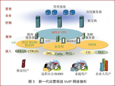 隨著以軟交換和MPLS/VPN兩項(xiàng)技術(shù)為核心的下一代網(wǎng)絡(luò)技術(shù)的不斷成熟和發(fā)展,將構(gòu)筑起新一代運(yùn)營商級(jí)的VoIP網(wǎng)絡(luò)雛形,如圖5所示。
