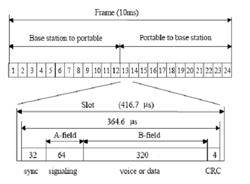 10ms時(shí)分多址(TDMA)幀(見圖1)之內(nèi)有24個(gè)時(shí)隙。此24時(shí)隙被平均分為兩組,每組12時(shí)隙。其中一組用于正向傳輸,另一組用于反向傳輸。信道的數(shù)據(jù)速度為32kbps。用于進(jìn)行話音通信的自適應(yīng)差分脈沖編碼調(diào)制(ADPCM)的數(shù)據(jù)速度也為32kbps。至于數(shù)據(jù)傳輸,使用的是循環(huán)冗余校驗(yàn)(CRC),每條信道能夠提供的數(shù)據(jù)速度僅為24kbps。因此,要想提高數(shù)據(jù)速度,就要同時(shí)使用多條信道。使用對(duì)稱連接時(shí),最多可用的信道為12條(12*24=288kbps)。為了達(dá)到更高的數(shù)據(jù)速度,可以使用不對(duì)稱信道連接。在這一情況下,至少有一時(shí)隙要用于接收確認(rèn),因此,有23個(gè)時(shí)隙可用于傳輸,最高速度可達(dá)264kbps(23*24=532kbps)。