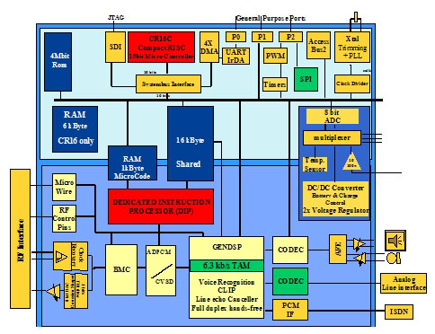 例如,SC14438是一個(gè)優(yōu)化了的CMOS芯片,能夠進(jìn)行DECT(1.9GHz)內(nèi)或2.4GHz ISM數(shù)字頻帶手機(jī)內(nèi)需要的所有音頻、信號(hào)及數(shù)據(jù)處理。一個(gè)ADPCM代碼轉(zhuǎn)換器,一個(gè)低功耗的編解碼器(CODEC)及模擬前端被集成于該芯片中,提供麥克風(fēng)與(動(dòng)態(tài)的)揚(yáng)聲器之間直接的連接。同時(shí)還整合了雙工免提操作。SC14438的設(shè)計(jì)適用于任一無(wú)線產(chǎn)品設(shè)計(jì)。一個(gè)專用的TDMA控制器能夠處理所有的物理層時(shí)隙和無(wú)線控制。美國(guó)國(guó)家半導(dǎo)體公司的標(biāo)準(zhǔn)小型RISC CR16B 16位微控制器對(duì)所有更高的協(xié)議棧實(shí)行控制。