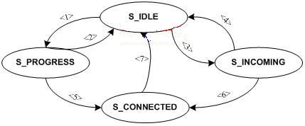 呼叫有四種狀態(tài):“S_IDLE”、“S_PROGRESS”、“S_INCOMING”、“S_CONNECTED”,它們之間的關(guān)系用一個(gè)有限狀態(tài)機(jī)來(lái)描述,如圖3。
