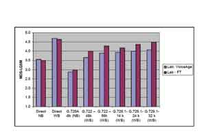 圖2對(duì)MOS(平均意見(jiàn)得分)值的分析深刻說(shuō)明了寬帶是如何被主觀感知的。窄帶G.729A的多數(shù)MOS值約為 3.5,而高清語(yǔ)音的MOS值至少比其高出30%,達(dá)到4.5。