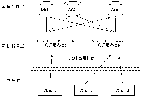 在大規(guī)模系統(tǒng)中,為保證數(shù)據(jù)庫訪問的效率和安全性,數(shù)據(jù)訪問方式一般采用由Client、中間層應(yīng)用服務(wù)器(或叫規(guī)則服務(wù)器)和Server組成的三層Client/Server結(jié)構(gòu)。將數(shù)據(jù)庫應(yīng)用劃分為邏輯上的三個層次,客戶程序只關(guān)心數(shù)據(jù)的顯示與用戶界面;應(yīng)用服務(wù)器處理客戶數(shù)據(jù)查詢與更新請求,可在應(yīng)用服務(wù)器上定義數(shù)據(jù)操作規(guī)則以保證數(shù)據(jù)操作的合法性、安全性與有效性。在三層結(jié)構(gòu)下,方便了軟件的修改和模塊的疊加,客戶端通過應(yīng)用服務(wù)器訪問數(shù)據(jù)庫服務(wù)器,客戶端并不直接與數(shù)據(jù)庫服務(wù)器建立連接,從而減輕了數(shù)據(jù)庫服務(wù)器的壓力,提高整個應(yīng)用系統(tǒng)的運行效率。