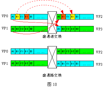 ATM中的兩種交換:虛通道交換(VCS:Virtual Channel Switching)和虛通路交換(VPS:Virtual Path Switching)。前者指同一個VP內或不同VP內的VC之間的交換;后者指一個VP內所有信元同時被映射到另一個VP內的過程。見下圖10。