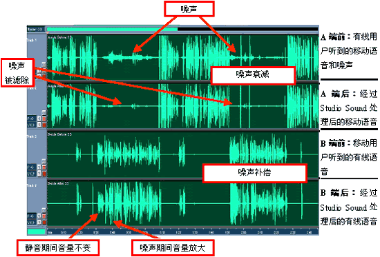 這里的結(jié)果顯示出,PSTN側(cè)收聽器接收到的噪音是如何被大大降低的,同時(shí)PSTN側(cè)說話的音量在無線側(cè)出現(xiàn)大聲的噪音期間被顯著地放大了。通過遍及全球的類似場合試驗(yàn),在應(yīng)用Studio Sound之前和應(yīng)用之后通話質(zhì)量的不同已經(jīng)深刻為許多業(yè)務(wù)提供商所了解。