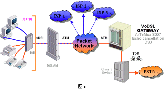 圖4給出了BLES的邏輯結(jié)構(gòu)。這種方式下,VoDSL廠商必須設(shè)計(jì)開發(fā)用于和已有的用戶設(shè)備、DSL網(wǎng)絡(luò)及Class 5交換機(jī)互通的接口設(shè)備;用戶側(cè)設(shè)備IAD為數(shù)據(jù)傳輸提供了Ethernet和ATM接口,為話音傳送提供了一定數(shù)量的模擬用戶線接口,每一接口都被分配了唯一的DSL電路。話音網(wǎng)關(guān)和Class 5交換機(jī)間的接口協(xié)議,在美國(guó)等地區(qū)采用GR-303和TR-08標(biāo)準(zhǔn),而在歐洲標(biāo)準(zhǔn)中使用V5.2接口。參見(jiàn)后面的圖6。