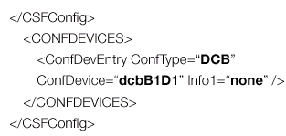 它由三個(gè)要素組成――CSFConfig、CONFDEVICES和ConfDevEntry。前兩個(gè)要素只用于為解析和數(shù)據(jù)收集過程中的每個(gè)ConfDevEntry提供環(huán)境。CONFDEVICES要素用于確定值所駐留的STL容器,容器(CONFDEVICELIST)的每個(gè)節(jié)點(diǎn)都包含一個(gè)對(duì)象,對(duì)象的成員變量名稱類似于XML文件中的屬性名稱――如ConfType、ConfDevice、Info1等等。成員變量的值將為屬性的值――DCB、dcbB1D1、及空值。