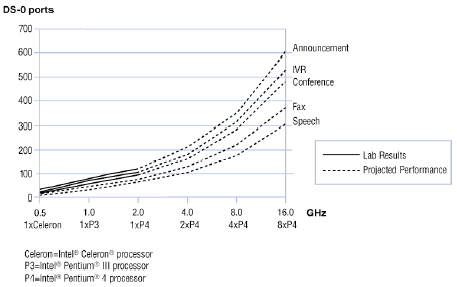 Dialogic 編制的HMP軟件,在Dialogic的從566 MHz 到 2 GHz的Celeron® 和 Pentium® 處理器上,已經(jīng)對(duì)語(yǔ)音宣告、IVR和會(huì)議算法完成了實(shí)現(xiàn)、優(yōu)化和測(cè)試。圖1中的實(shí)線表示實(shí)驗(yàn)室中的測(cè)試結(jié)果。Dialogic的目標(biāo)是實(shí)現(xiàn)這些算法,并擴(kuò)展到更高速的Dialogic® Pentium® 處理器,雙路、四路、甚至八路Dialogic® Pentium® 處理器,Dialogic® Xeon® 處理器、以及Dialogic® Itanium® 處理器。圖1中的虛線顯示了Dialogic所期望的在未來(lái)的實(shí)現(xiàn)中將得到的結(jié)果。