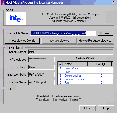 2. 如果HMP許可證管理器GUI沒(méi)有在屏幕上,可通過(guò)開(kāi)始 > 程序> Dialogic HMP 1.0 > HMP 許可證管理器訪問(wèn)它。.