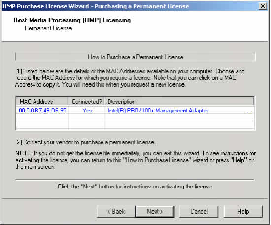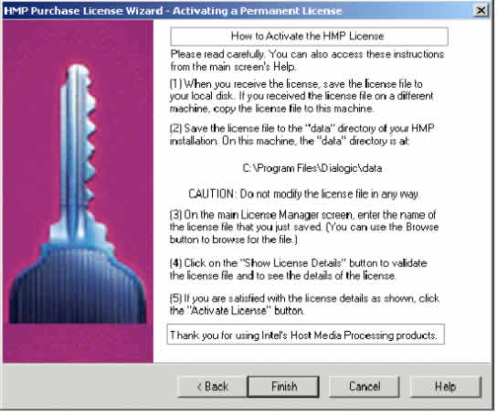 • 購(gòu)買(mǎi)并激活一個(gè)永久的HMP 許可證. 可通過(guò)打開(kāi)HMP許可證管理器,具體方法為:開(kāi)始> 程序> Dialogic NetStructure HMP 1.0 > HMP許可證管理器:參見(jiàn)第4章"主機(jī)媒體處理軟件的許可證程序"。