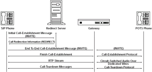 圖5里的重定向服務(wù)器,只處理發(fā)給被叫方的第一個INVITE消息,并反饋一個特殊的回應(yīng)給主叫方。主叫方從回應(yīng)中取出一個新的地址,并給這個地址發(fā)送INVITE消息。這個地址可能是真實的被叫方,代理服務(wù)器或者另一個重定向服務(wù)器。從這以后,所有消息都直接在主叫方和新的地址之間傳遞。