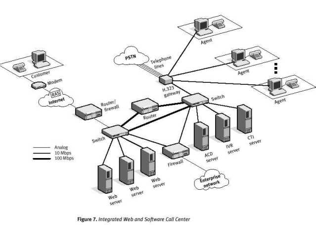 向基于軟件的呼叫中心模型遷移的第一步:通過使呼叫中心具有Web能力,將來自因特網(wǎng)的呼叫接入到現(xiàn)有呼叫中心中。圖5展示了H.323網(wǎng)關(guān)如何轉(zhuǎn)換VoIP呼叫到現(xiàn)有自動呼叫分配器(ACD)支持的傳統(tǒng)電話呼叫。這一簡單步驟,使公司能夠通過基于因特網(wǎng)的電話連接客戶。然而,在客戶所見到的Web頁面和業(yè)務(wù)代表的Web內(nèi)容及CTI數(shù)據(jù)之間,通常既沒有邏輯連接,也沒有物理連接。(CTI數(shù)據(jù)的獲得可能會通過在客戶的瀏覽器上下載一個代理或一個JAVA小程序?qū)崿F(xiàn),通過它發(fā)出客戶的位置等相關(guān)數(shù)據(jù))。因此在大多數(shù)情況下,客戶和業(yè)務(wù)代表在購買或支持過程中通過交談而解決問題。
